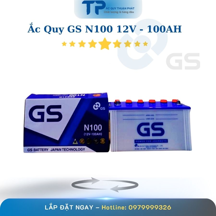 Bình ắc quy GS N100 có thông số danh định 12V và dung lượng 100AH, thuộc dòng ắc quy nước truyền thống (flooded).